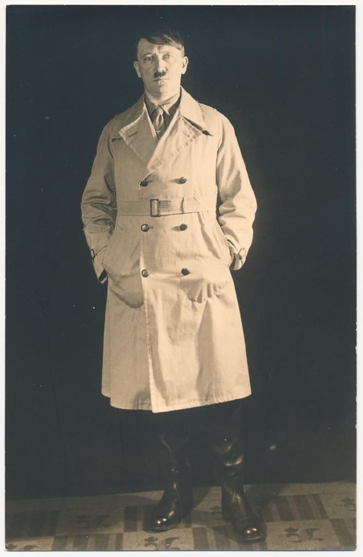 This is a really nice portrait pairing of Adolf Hitler in a trench coat holding his dog whip. These were both taken in 1928.
