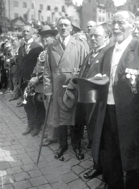 Adolf Hitler with NSDAP Bavarian party members watch the SA parade at the Deutscher Tag (German Day commemorating the anniversary of the battle of Sedan) in Nuremberg on 2 September 1923.