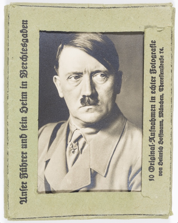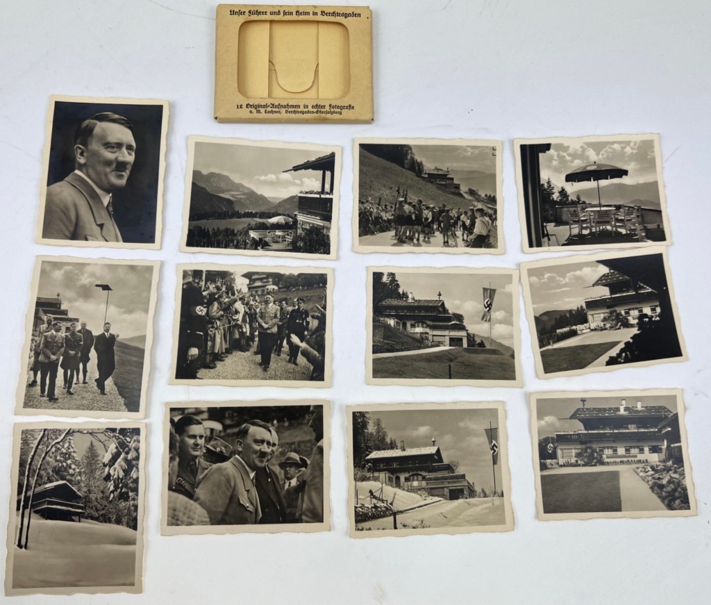 These ten souvenir photographs (2 1/2″ x 3 1/2″) comprised the set titled “Unser Führer uns sein Heim in Berchtesgaden” (“Our Führer and His Home in Berchtesgaden”). These were published by the studio of Hitler’s personal photographer Heinrich Hoffmann in Munich. The set includes an interior and exterior view of “Haus Wachenfeld”, the small chalet which was converted into the site of Hitler’s mountain estate, the Berghof, through massive renovations which took place on the site in 1936. The remaining eight photos consist of views of Hitler, primarily candid views including an image of the dictator standing before Haus Wachenfeld with Rudolf Hess, three images of Hitler with children at Berchtesgaden (two showing him with Bernile Nienau, known as “the Führer’s child”, who was later discovered to be one-quarter Jewish), with his dog and feeding deer in the property. Each photo is captioned, numbered, and marked with Hoffman’s address on the reverse. The set was secured within a small green paperboard case, bearing the printed title of the set and bearing Hoffmann’s publishing line.