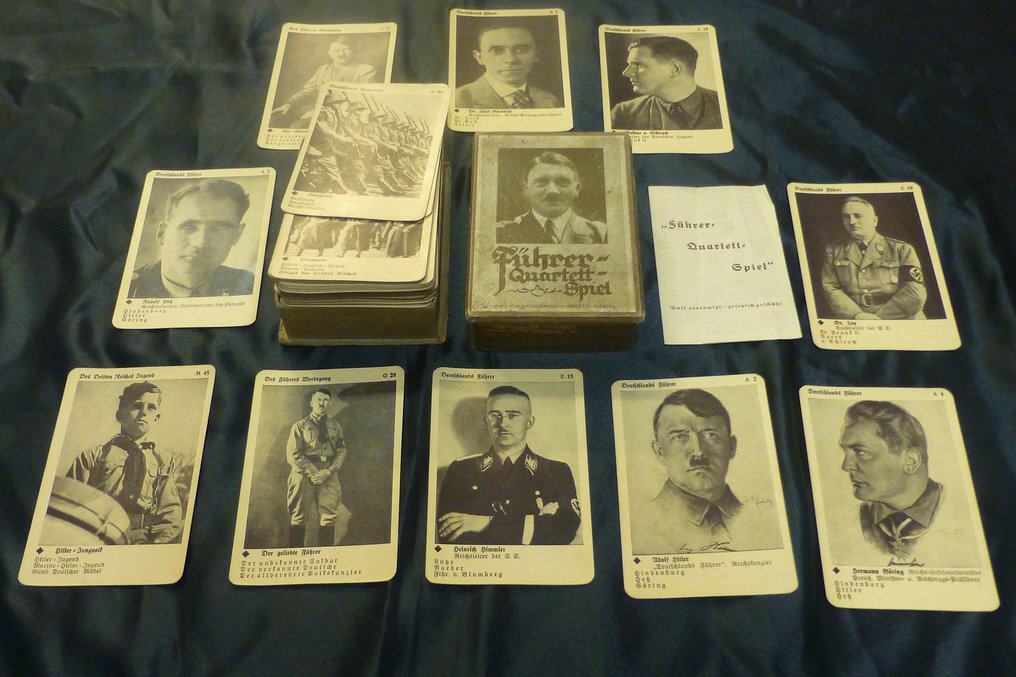 ‘Führer Quartett’ was a family game that consisted of a deck of 60 cards and was released in 1935. This Nazi card game was based on the traditional game of ‘snap’ with cards showing various images of Adolf Hitler, high ranking Nazis, and SA and SS soldiers. The game appears to have had two different versions, one creates a picture of Hitler’s rise to power and another features idyllic scenes from his private life. Each card was labelled with a number and letter (1A, 2A, 3A, 4A, IB, 2B, 3B etc.), and the aim of the game was to match and collect complete sets of 4 cards.