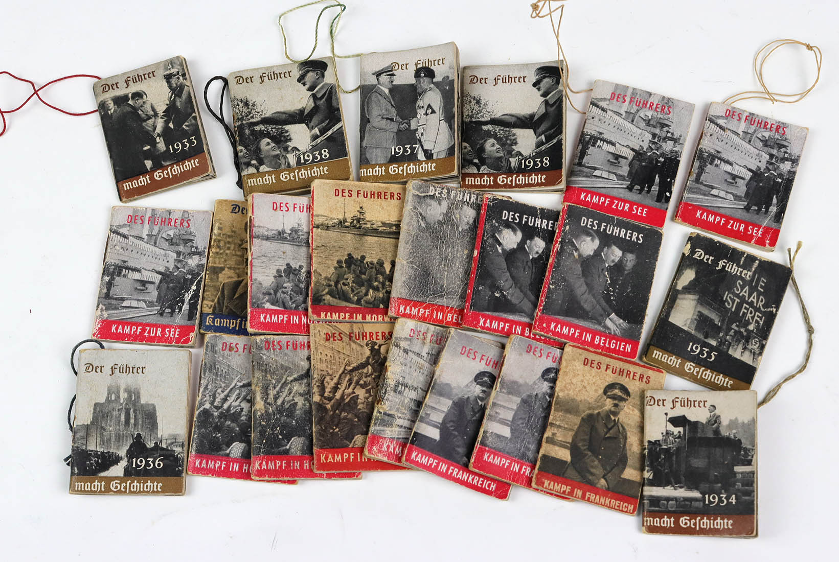 These tiny books were sold to raise funds to support various charities. In Nazi Germany the Winterhilfswerk (Winter Charity Campaign, or WHW) collection campaigns took place each Winter and raised a great deal of money for charity such as the German Red Cross. This series of booklets were published from 1937 -1941 by Heinrich Hoffmann, Hitler’s official photographer. There were 26 different books in total to collect. The booklets had a string, so one could wear them from a lapel pin, to show that you had made a donation. The following week, when there was a new series of badges & tokens to collect, the booklets could then be hung elsewhere in the home, such as from the Christmas Tree along with other Reich approved ornaments.