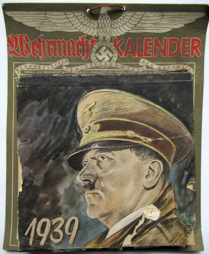 Both wall and desk calendars were produced between the years 1939 and 1944. The desk calendar pages were printed on heavy card stock that were to be torn off once a week and would also function as postcards. A special calendar was also published by the Deutsches Verlagshaus in Dresden in the year Hitler celebrated his 50th birthday. After the end of each week a page would be torn off and another photo of Adolf Hitler would decorate the room for that week – so 52 unique photos were featured of a place or event directly connected to him.