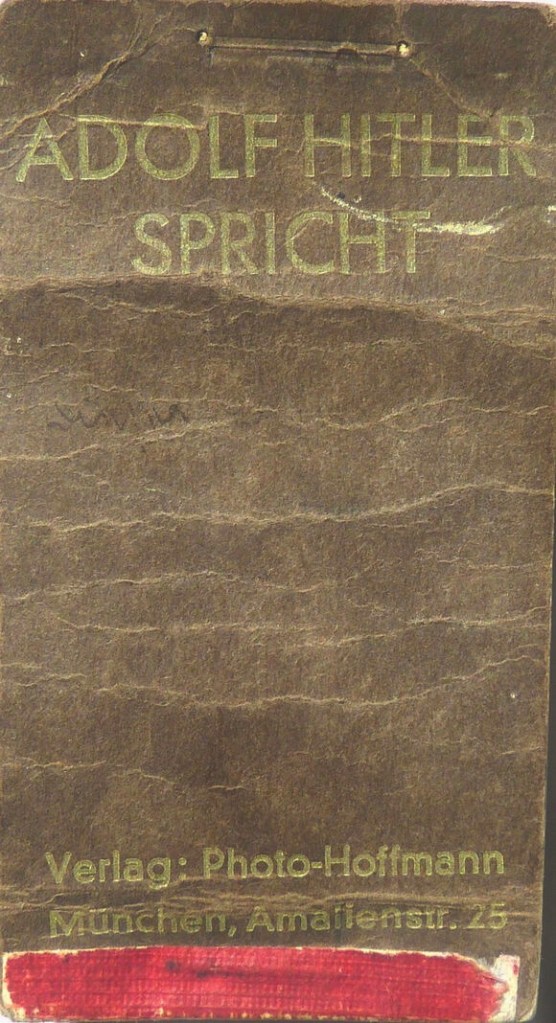 Hoffmann produced a photo flip book in 1929, flip the pages with your thumb and it looks like Hitler is moving as he gives his speech. This also showed how propaganda ideas can fail. It shows a wildly gesticulating Hitler addressing the Sturmabteilung (SA), the party’s paramilitary branch, on the Luitpoldhain at the 1929 Nazi Party Rally in Nuremberg. In the background are standards with large swastikas, a few members of the SA, and a hedge. At that time the Luitpoldhain was still a park, not the cleared open arena that it would become in 1933. The uniformed SA members had to position themselves amid hedges, a fountain, and parkland trees – hardly the perfect setting for a grand parade and speech. This was the last flip book that Photo Hoffmann produced. Even other sources only made two more such flip books: Erich Bethe sold one named “Greeting from the Führer,” and the Hamburg publishers Wahler und Sohn published one called “The Führer Speaks” shown below.