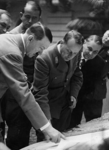 Adolf Hitler in Weimar in 1936 looking at a model for the new design of the Museumsplatz with Albert Speer and Gauleiter Fritz Sauckel.
