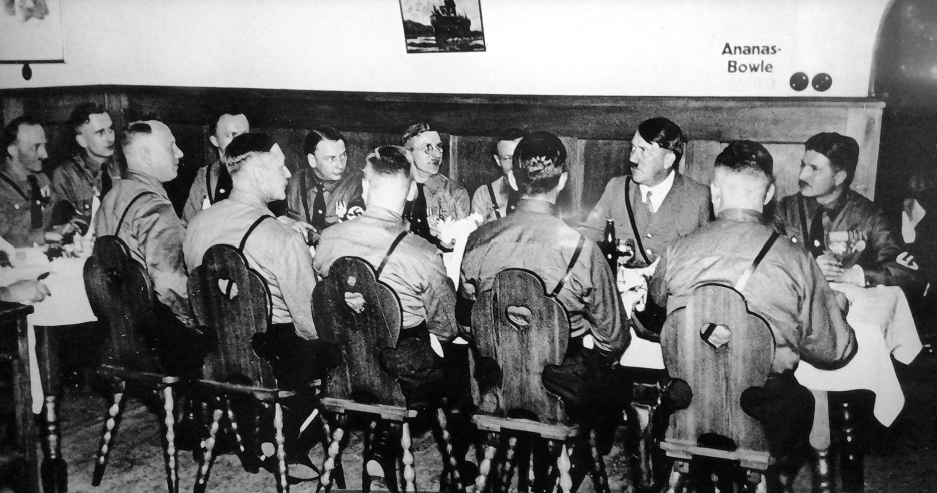 Adolf Hitler with former members of the “Stosstrupp Hitler” in the basement tavern of the Brown House celebrating the 10th anniversary of the Beer Hall Putsch. Among the participants are Emil Maurice (right next to Hitler) and Karl Fiehler (second to the left and Mayor of Munich from 1933-1945) on 8 November 1933. The restaurant consisted of several narrow low vaulted rooms. The sign reading “Ananas-Bowle” above Hitler’s head is for a special German pineapple punch drink.