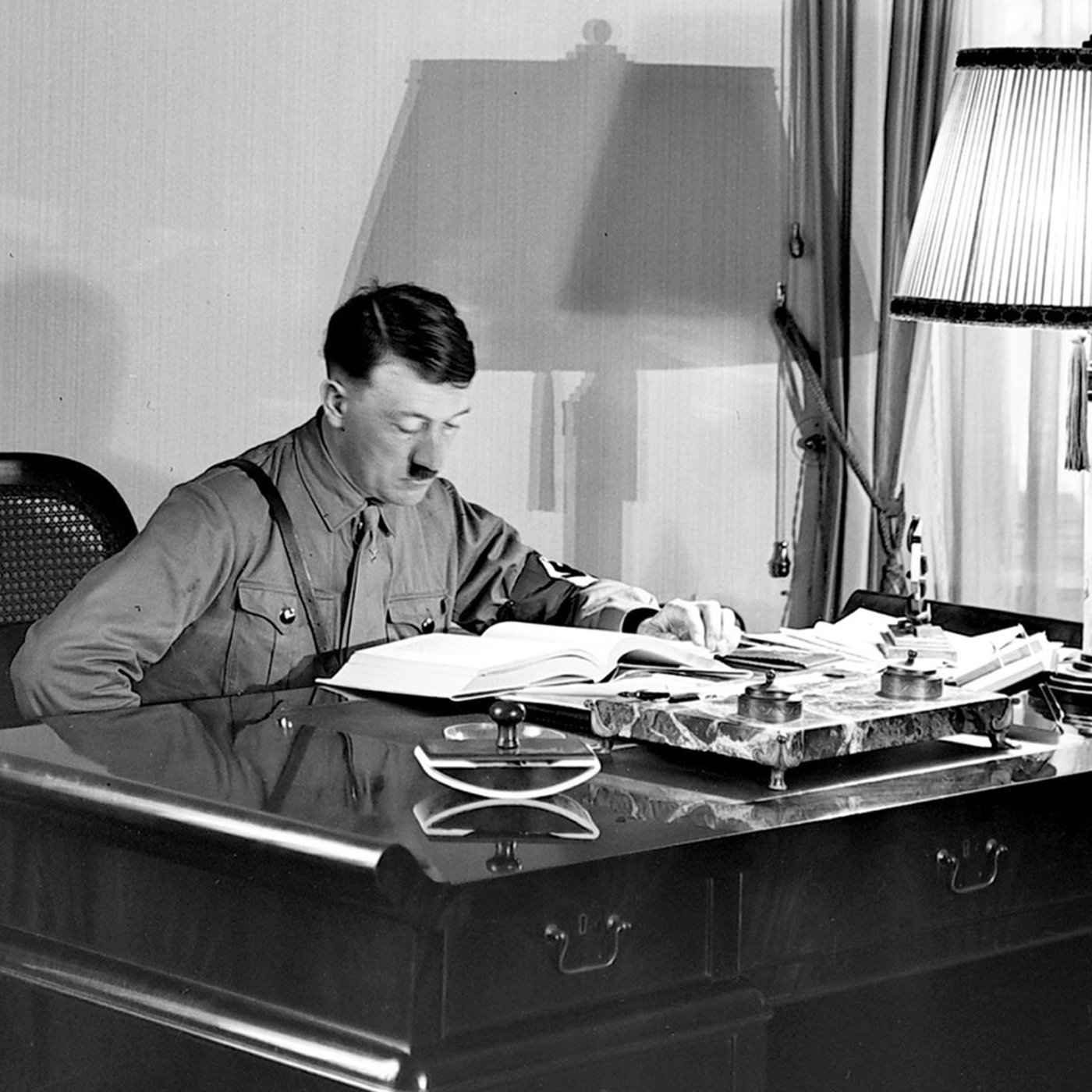 Adolf Hitler reads a book at his desk in the ‘Brown House’ in Munich on 2 January 1933. Notice the paperweight of a swastika with a snake wrapped around it.