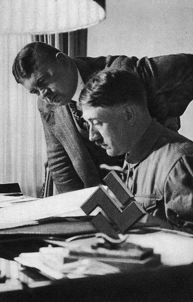 Adolf Hitler and architect Paul Ludwig Troost among the workers during the topping out ceremony in the ‘Brown House’ in Munich. Left, next to Hitler is the architect of the renovation Paul Ludwig Troost, right, next to Hitler is the Reich Treasurer, the Nazi Party Leader Franz Xaver Schwarz, 1930.