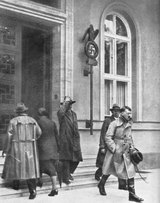 Adolf Hitler leaving the Braunes Haus in 1931, with his dog whip in tow. Note the ornamental iron swastikas on the door. This photograph was featured in Heinrich Hoffmann’s book, “Hitler wie ihn keiner kennt” (Hitler as No-one Knows Him), published in 1935.