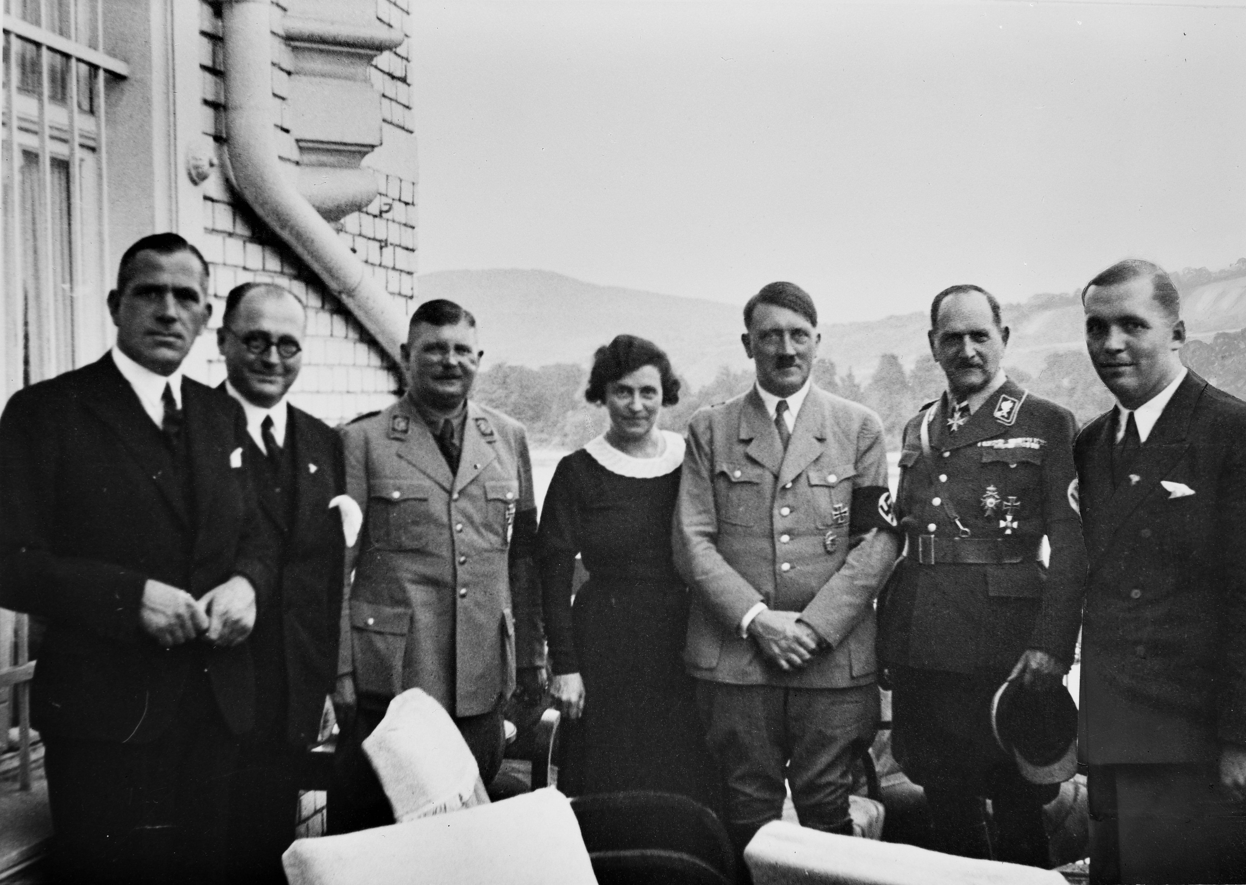 Adolf Hitler on the Marienburg airfield in East Prussia on 3 July 1934, in the background is Hitler’s Junkers Ju 52 airplane. His plan is to meet with Reich President Paul von Hindenburg at his Neudeck estate to explain his successful suppression of the “Roehm Putsch”. Heinrich Hoffmann is third from the right.