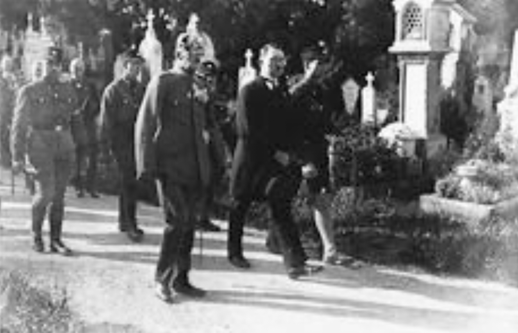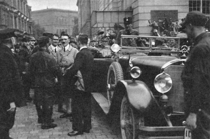 Two years earlier, another run-in with the Reichsbanner-Schwarz-Rot-Gold resulted in the death of a young shoemaker and member of the SA group “Hochland”. On the evening of 25 May 1927, Georg Hirschmann and five other SA men were chased down through the streets of Gisingen for over an hour by a few dozen political opponents, including members of the Reichsbanner-Schwarz-Rot-Gold, after a fierce verbal argument had erupted. After being brutally kicked and beaten with a wooden slat, Hirschmann suffered a severe concussion and passed the following day. Adolf Hitler attended his funeral on 30 May 1927 in the Ostfriedhof cemetery in Munich along with Rudolf Hess, Bruno Heinemann and Rudolf Buttmann, and delivered the eulogy. Two very rare photographs of Adolf Hitler and Rudolf Hess arriving for the ceremony are shown below.
