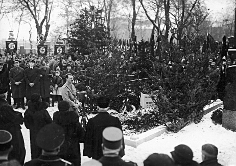 Adolf Hitler didn’t attend Wessel’s funeral held on 1 March 1930, a decision he based on Göring’s advice that the possibility of an attack on him in the heart of “Red Berlin” was far too great. Hitler did speak at Wessel’s gravesite three years after his death, on 22 January 1933, for the dedication of a memorial. Hitler called Wessel a “blood witness” whose song had become “a battle hymn for millions”. He said that Wessel’s sacrifice of his life was “a monument more lasting than stone and bronze”.