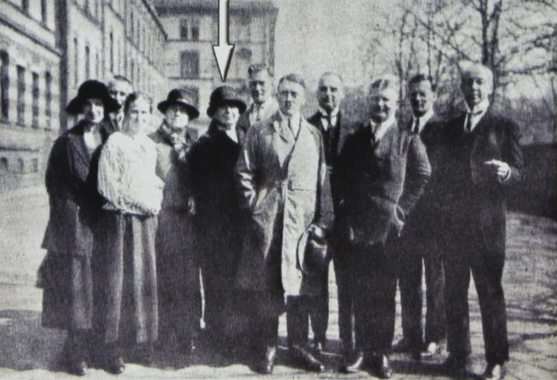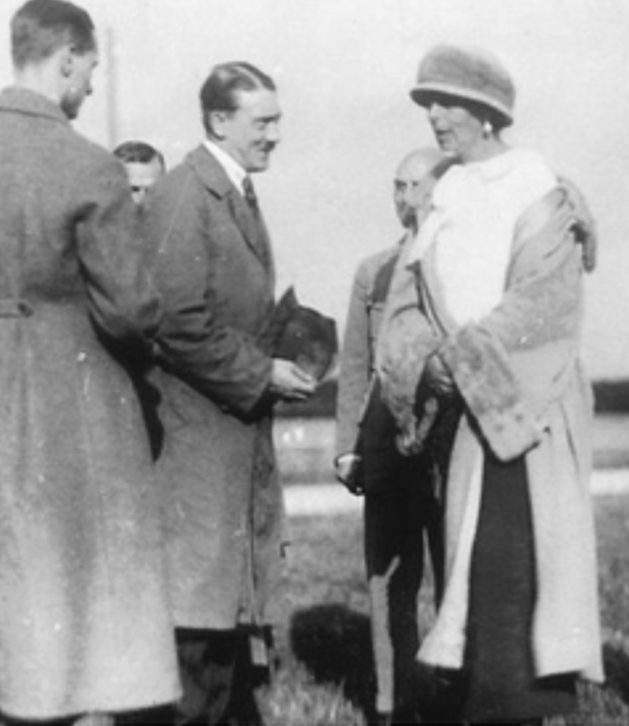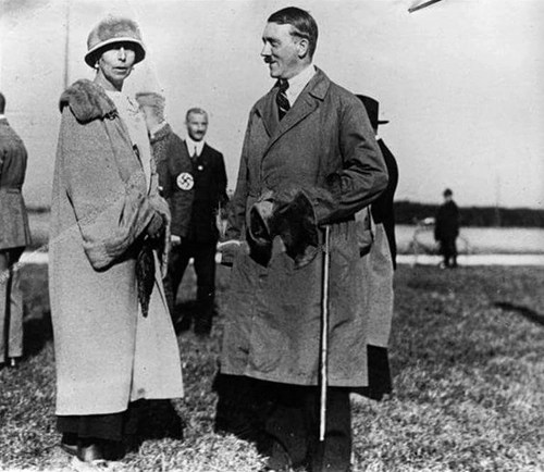 Adolf Hitler in conversation with Victoria Melita of Russia in Fröttmaning on 15 April 1923. While in Germany, Victoria showed an interest in the Nazi Party, which appealed to her because of its anti-Bolshevik stance and her hope that the movement might help restore the Russian monarchy.