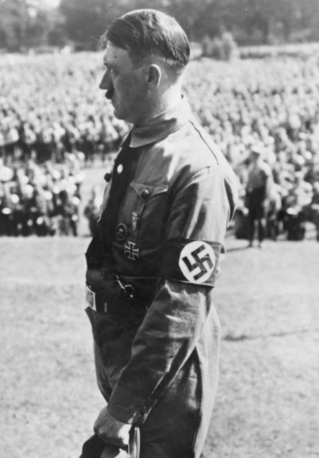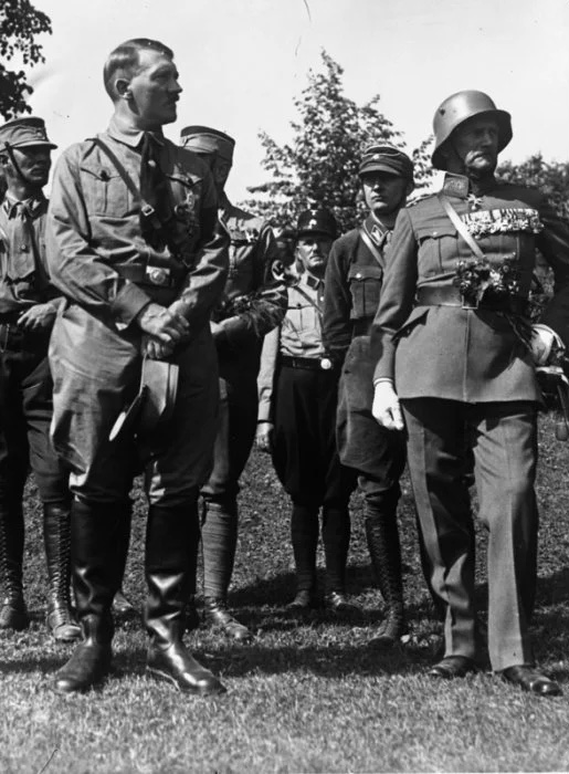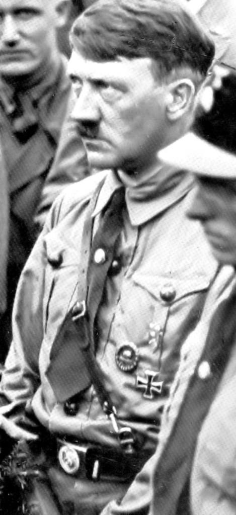 Rare photograph of Adolf Hitler where you can see him holding a concealed pistol in his pocket. Behind him is Rudolf Hess.