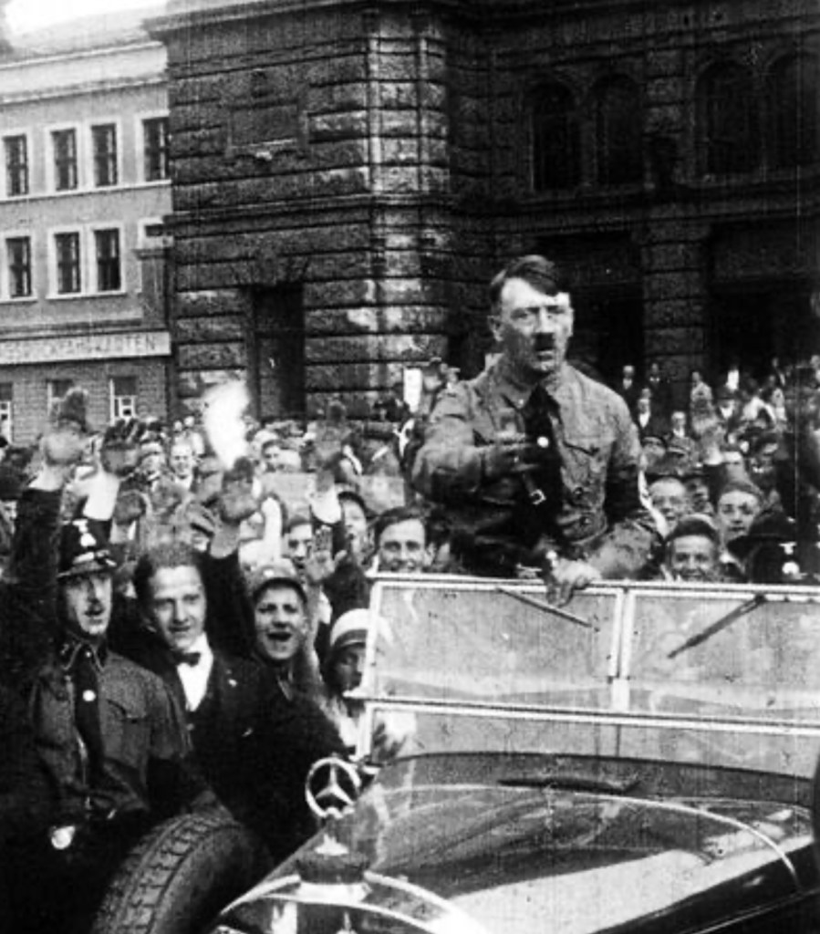 Adolf Hitler at the NSDAP Rally in Nuremberg, in front of Frauenkirche in 1929.
