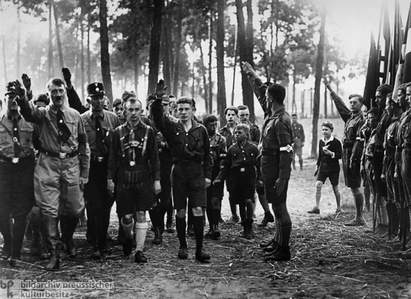 Adolf Hitler marching with arriving Hitler Youth at the 4th Reich Party Congress Nuremberg in August 1929.