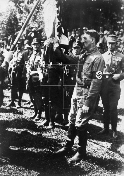 Adolf Hitler gives a speech to the SA in Luitpoldhain for the 1929 Reichsparteitag. This photo was featured in a 1938 edition of LIFE magazine.