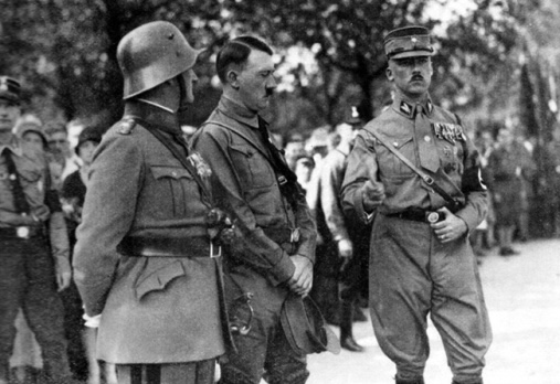SA leader Franz Pfeffer von Salomon (2-l), Reich propaganda leader Joseph Goebbels (3-l), and the head of the NSDAP Adolf Hitler (r) during the Reich convention of the NSDAP in Nuremberg, Germany, on 2 August 1929.