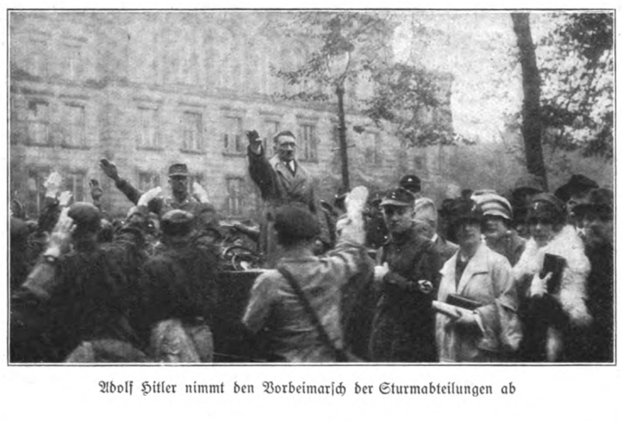 ”Adolf Hitler reviews the march-past of the Sturmabteilung (SA).” Hitler also gave a speech on the Burgplatz in Essen on 24 April 1927, before delivering a speech for the Gauparteitag in the exhibition halls in Norbertstraße 2 in front of 14,000 listeners. Hitler also attended a speech delivered by Joseph Goebbels in the municipal hall building.