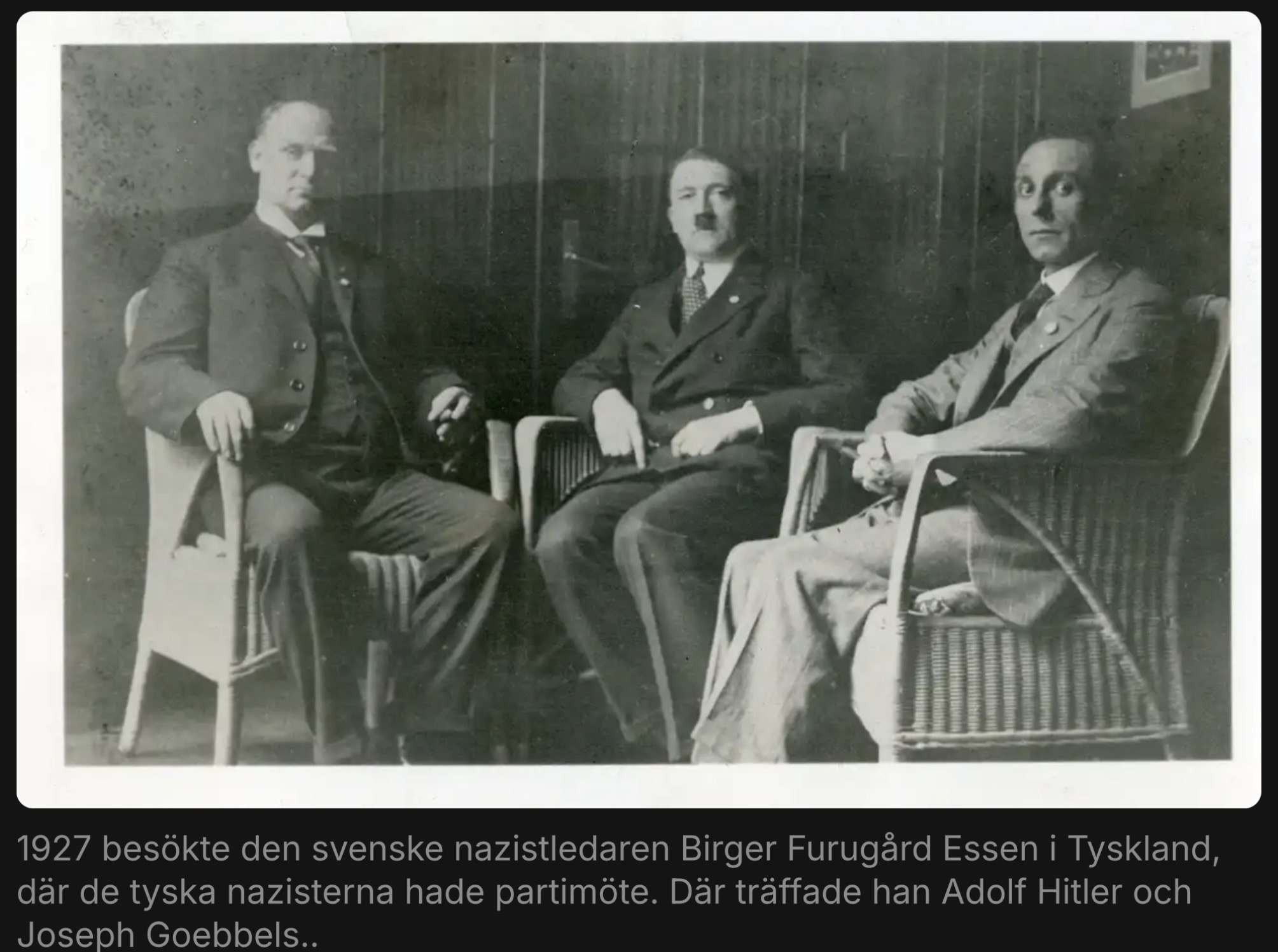 In 1927, Swedish Nazi leader Birger Furugård visited Essen, Germany, where the German Nazis were holding a party meeting. There he met Adolf Hitler and Joseph Goebbels.