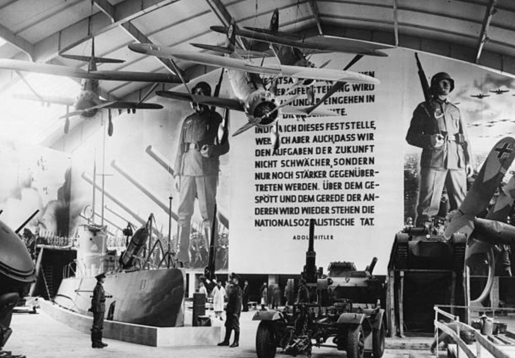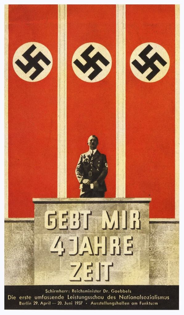 On 30 April 1937 the Nazi leadership opened a major exhibition in Berlin entitled “Gebt mir vier Jahre Zeit’’ (Give Me Four Years Time). The title of this special exhibition that ran from 30 April – 20 June 1937 was derived from a famous Hitler speech, “give me four years time and you will not recognize Germany”. The exhibition was intended to show the German people the many successes of the first Nazi Four Year Plan. In particular, it showed them that Hitler had been able to dispel the shame and humiliation imposed on Germany by the Treaty of Versailles that ended World War I in 1919. The Treaty had stripped Germany of territories (especially in re-creating Poland), demilitarized the Rhineland (forbidding the German military to occupy this buffer zone), and imposed harsh economic sanctions. It also imposed severe limits to Germany’s armed forces, allowing only six battleships, no submarines, no tanks, no air force, and an army of 100,000 without a draft. The Treaty also blamed Germany for all the horrors of the war and imposed reparations payments to the victorious Allies. Hitler and his party used the signing of the Treaty as a pretext to rebuild Germany so that this could never happen again.