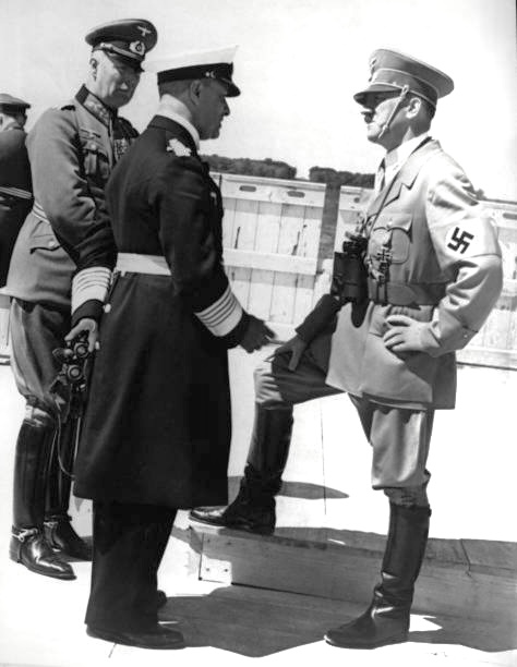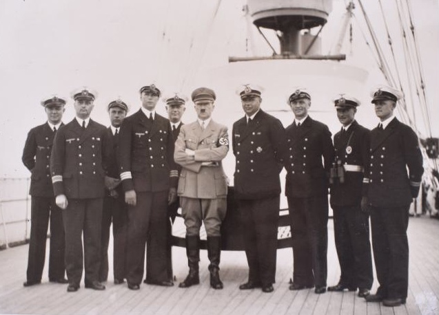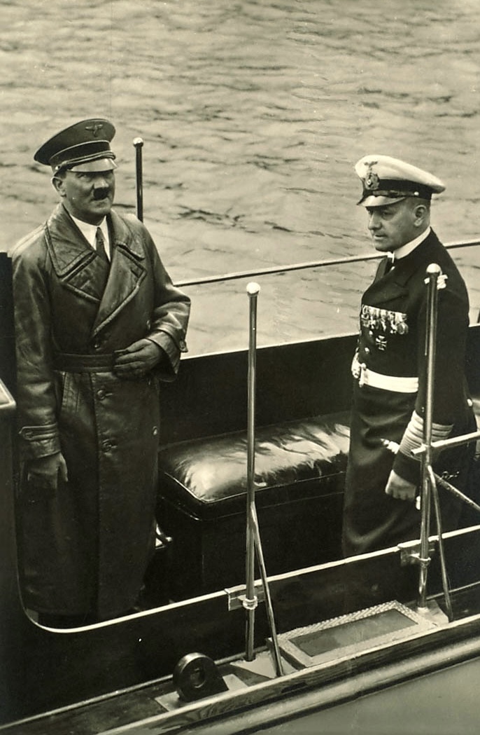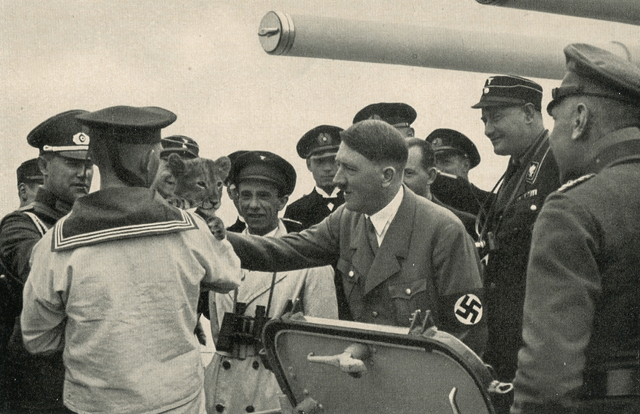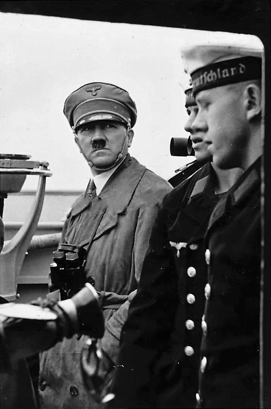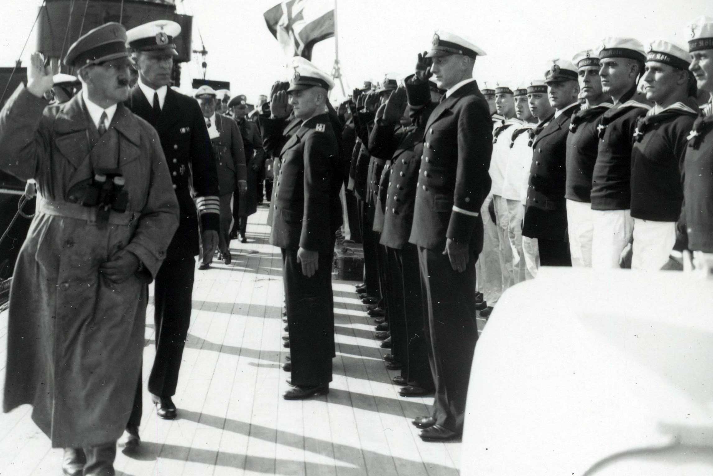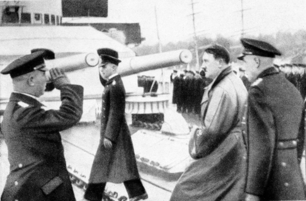 Adolf Hitler stands in front of the Reichskriegsflagge on the battleship Deutschland between Swinmünde and Memel on 23 March 1939.Adolf Hitler on the battleship “Deutschland” in the harbor at Memel on 23 March 1939.Adolf Hitler on a unit of the Navy visiting the captured Gdynia naval base in Poland on 21 September 1939. The Germans’ main push towards Gdynia had begun on 8 September and they captured Gdynia six days later on 14 September.