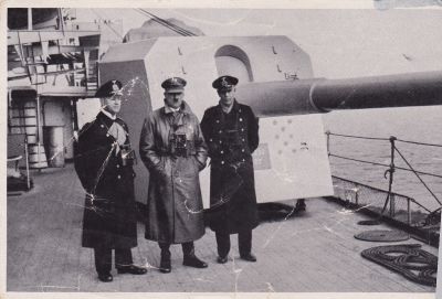 Adolf Hitler inspecting the Bismarck at Gotenhafen (Gdynia) Poland on 5 May 1941.Adolf Hitler stands in the forward fifteen inch gun turret of the battleship Bismarck during a visit to the occupied Polish port of Gotenhafen. Among Hitler’s entourage was Field Marshal Wilhelm Keitel, the head of the German armed forces. Next to Hitler is Ernst Lindemann, the chain smoking captain of the battleship. Lindemann was a gunnery specialist himself, and a graduate of the naval academy at Murwik. Inspektion von Kriegsschiffen 5. Mai 1941