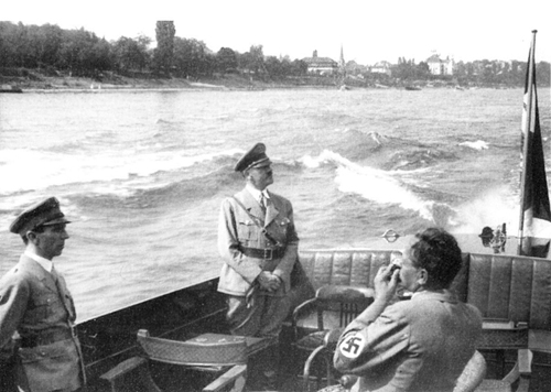 Adolf Hitler on the Rhine river aboard the Preussen steam boat near Kaub on 10 April 1936. In the background is the Pfalzgrafenstein Castle. This journey is significant as it occurred shortly after German troops remilitarized the Rhineland. The remilitarization of the Rhineland was a violation of the Treaty of Versailles, which had forbidden Germany from stationing armed forces in the area. Rudolf Hess and Joseph Goebbels converse aboard the Rhine steamship Preußen on 10 April 1936 as Hitler takes a snooze in the background. (Previously misattributed to the Aviso Grille visit of 29 August 1935).Adolf Hitler relaxes with Reich Propaganda Minister Joseph Goebbels and Reich Governor Röver on the deck of the Preußen steam boat on 10 April 1936.