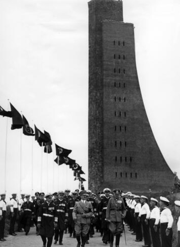 Adolf Hitler attended the opening ceremony of the Laboe Naval Memorial on 30 May 1936 after having observed naval maneuvers and watched a parade in Kiel from the light battleship Aviso Grille. At a ceremony commemorating the dead of the Great War on the twentieth anniversary of the Battle of Skagerrak (May 31, 1916), Hitler laid a wreath honouring the navy’s dead. Apparently Hitler hated the design of the monument in Laboe, calling it “an unrivalled essay in kitsch and bad taste, as it stands there with its inverted bow.”