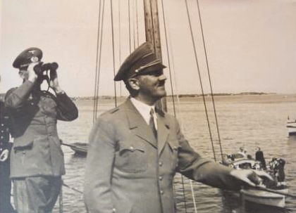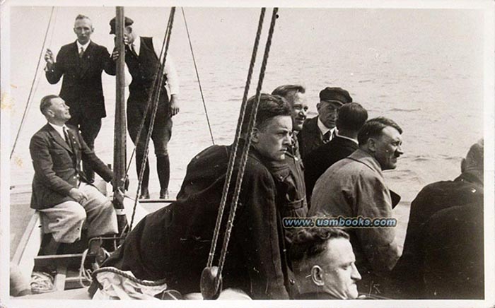 Adolf Hitler is among the passengers on a small sailboat that departed from the Strandhotel zur schönen Aussicht in Horumersiel-Schillig on the North Sea on 25 May 1932. Julius Schaub stands at the center next to a person looking out with binoculars. To the far right Wilhelm Bruckner kneels on the edge of the boat. From an album assembled by Ernest Zaske, a member of the SS on the personal staff of Rudolf Hess.On a boat trip together: Adolf Hitler (2nd from left) and Paul Knüpling (front, middle) of Wildeshausen join other members of Hitler’s 1932 campaign staff. Adolf Hitler later visited the beach hotel in Horumersiel-Schillig on the Northsea coast again on 11 June 1936, after it has been a campaign headquarters during the 1932 elections. The hotel was run by Fritz Tiartz, who may have also been out on this excursion.Adolf Hitler stayed at the Strandhotel zur schönen Aussicht, Horumersiel-Schillig for a week in late May 1932 and took a boating excursion out on the North Sea with Wilhelm Bruckner (seated far left) and other members of his 1932 campaign staff on the 25th of May.