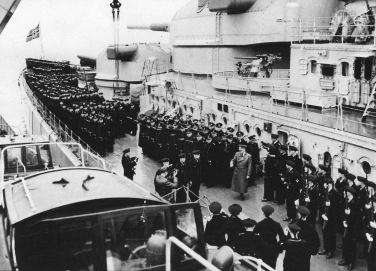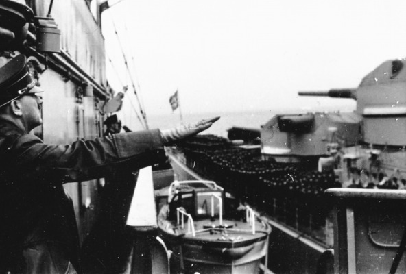 On 5 May 1941 Hitler travelled from Danzig by car ride to Gotenhafen (Gdingen/Generalgouvernement) and to the port in Gotenhafen. He boarded the cutter “Hela” to head for inspections of the Bismarck followed by her newly commissioned sister ship the Tirpitz, which was docked alongside in the harbor. A reception party, headed by Admiral Gunther Lutjens and Captain Lindemann, greeted their commander-in-chief as he boarded. As the battleship’s entire crew stood to attention, the now infamous photograph of Lutjens greeting Hitler with a naval salute, rather than the traditional Nazi one, was taken before the tour commenced. After Hitler toured the battleship, the visiting party joined the Bismarck’s senior officers for a one course vegetarian lunch, Hitler’s well-known preference, in the wardroom.