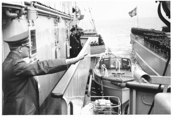 During the fleet parade of the Kriegsmarine, the battleship “Gneisenau” passes the “Aviso Grille” with Adolf Hitler and his guest, Admiral Horthy, the Hungarian Regent and ally of Hitler.
