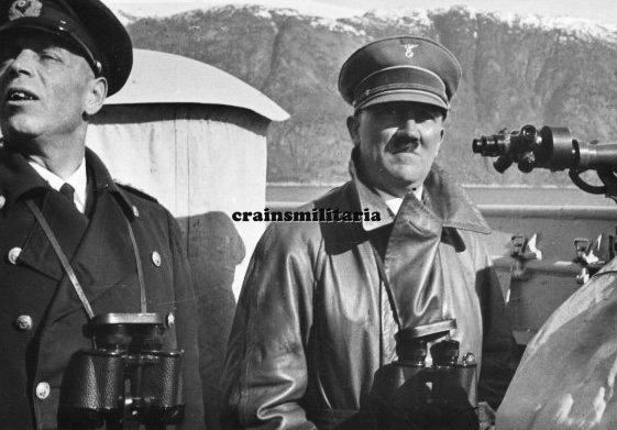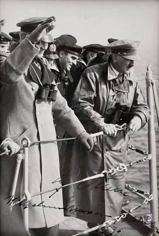 Postcard Führer Adolf Hitler, Reichskriegsminister Blomberg, Oberbefehlshaber Kriegsmarine Raeder / Postcard Führer Adolf Hitler, Reich War Minister Blomberg, Kriegsmarine Commander-in-Chief Erich Raeder boarding the Deutschland on 12 April 1934 for a two day excursion to Norway.Adolf Hitler on deck of the Panzerschiff Deutschland with Admiral Erich Raeder on 14 April 1934. In the background is Balestrand, Norway.Adolf Hitler observes the scenery from on board the Deutschland while touring the Norwegian fjords in April 1934. “Adolf Hitler: Bilder aus dem Leben des Führers”. Sammelwerk Nr. 15 Adolf Hitler Bild Nr. 162 Gruppe 67Adolf Hitler observes the scenery on board the Deutschland in the Norwegian fjords, April 1934. One of the few pictures that exist of Hitler when he visited Norway without having setting foot on Norwegian soil. In the book “Hitler’s Norway”, historian Berit Nøkleby writes that “the visit was not official, he did not go ashore anywhere, and only two Norwegian pilots met him during the trip”. ”Midday sun in the fjord”. From left: The navigation officer Korvettenlapitän Junker, the head of the naval command, the Führer, the Minister of Defense. Adolf Hitler with Erich Raeder and Werner von Blomberg in Norway. Published in Illustrierter Beobachter / Folge 18 Samstag, 5. Mai 1934, 9.Jahrgang.Adolf Hitler an Bord der “Deutschland” eine Fahrt in die Nordsee.Adolf Hitler presented this signed photograph from his Norway cruise while in WiIhelmshaven at the launch of the battleship “Scharnhorst” on 3 October 1936.Adolf Hitler during a trip to Norway with Panzerschiff Deutschland, 1933-’34. He is flanked by the ship’s commander, Kapitän Hermann von Fischel (later Vizeadmiral). Sammelbild 15 Adolf Hitler Nr. 141 Der Führer inmitten seiner blauen Jungen, Matrosen, Kriegsmarine / Collector’s picture from “Adolf Hitler: Bilder Aus Dem Leben Des Führers” No. 141 ‘The leader in the midst of his blue boys, navy sailors aboard the Deutschland on 12 April 1934’.Nordsee.- Adolf Hitler, Generaloberst Werner von Blomberg und Admiral Erich Raeder auf dem Panzerschiff “Deutschland”, 12 April 1934.Adolf Hitler with Naval Officials including Kriegsmarine’s Grand Admiral Raeder (left) and the commander of the Deutschland Captain Hermann von Fischel (right) during the Norway trip in 1934 on board the Deutschland.Adolf Hitler with Naval Officials including Kriegsmarine’s Grand Admiral Raeder (left) and the commander of the Deutschland Captain Hermann von Fischel (right) during the Norway trip in 1934 on board the Deutschland.