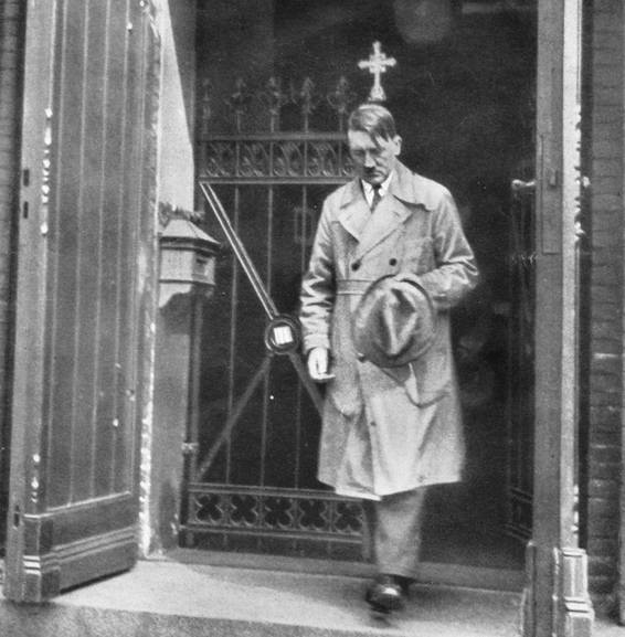 The following two photographs were also taken in Wilhelmshaven on 26 May 1932. The first one shows Adolf Hitler leaving the Reichsmarine Garnisonkirche (Navy Garrison Church) and was featured in Heinrich Hoffmann’s “Hitler wie ihn keiner kennt” (Berlin: “Zeitgeschichte” Verlag, 1932). The caption read: “A photograph accidentally becomes a symbol. Adolf Hitler, the supposed ‘heretic,’ leaves the Marine Church in Wilhelmshaven.” The second photo, also featured in this same book covering Hitler’s 1932 campaign journey, reads “On the North Sea, the Führer observes the maneuvers of the Reichsmarine. ‘The three inseparables’, the leader, his private secretary Hess and his driver Schreck,” and shows Hitler sitting on a dike looking out over the Sea.