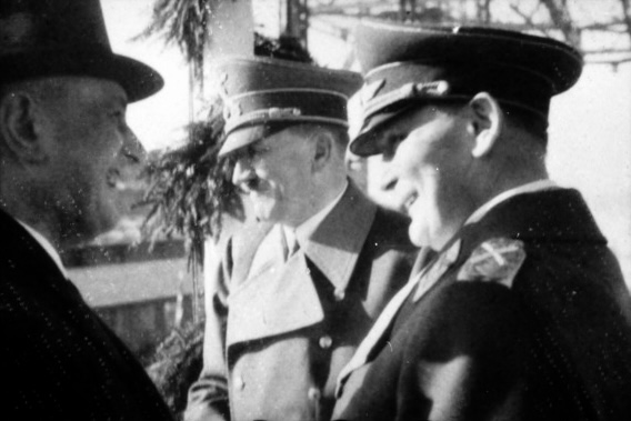 Adolf Hitler arrives in Wilhelmshaven with Rudolf Hess and Heinrich Himmler for the state election campaign on 26 May 1932. The cruiser Köln can be seen in the background.