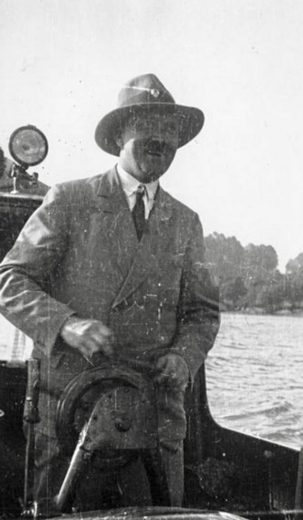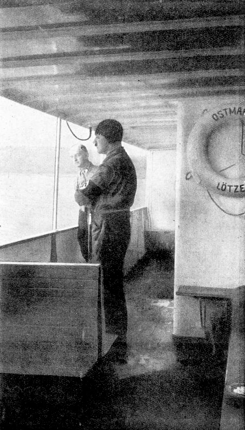 Adolf Hitler takes a cruise on Lake Niegocin in Lötzen (now Giżycko, Poland) on Das Motorschnellschiff Ostmark on 16 July 1932. The region of Masuria (Polish: Mazury; German: Masuren) in northern Poland is famous for its 2,000 lakes. Hitler delivered a speech at the fairgrounds in Lötzen in front of 5000 listeners earlier this day.