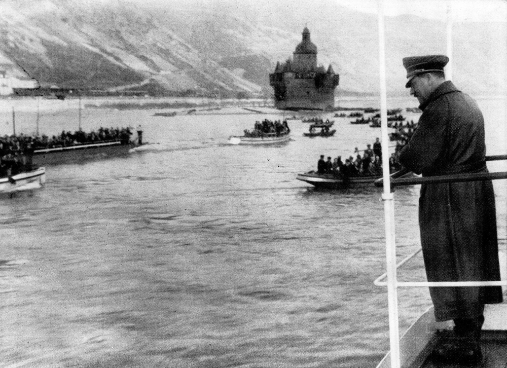 On 10 April 1936 Adolf Hitler took another cruise on the Rhine river aboard the tour ship ‘‘Preussen”, a steam boat constructed in 1885. Here Hitler is seen passing the Pfalzgrafenstein Castle near Kaub on his tour down the Rhine from Koblenz to Mainz. The Bereisungsschiff Preussen was based in Koblenz-Ehrenbreitstein, the seat of the Rhine construction administration. In addition to its function as a tour ship, it was also used for representational purposes and there were many high-ranking personalities that had traveled on board including Kaiser Wilhelm II and Reich President Paul von Hindenburg.