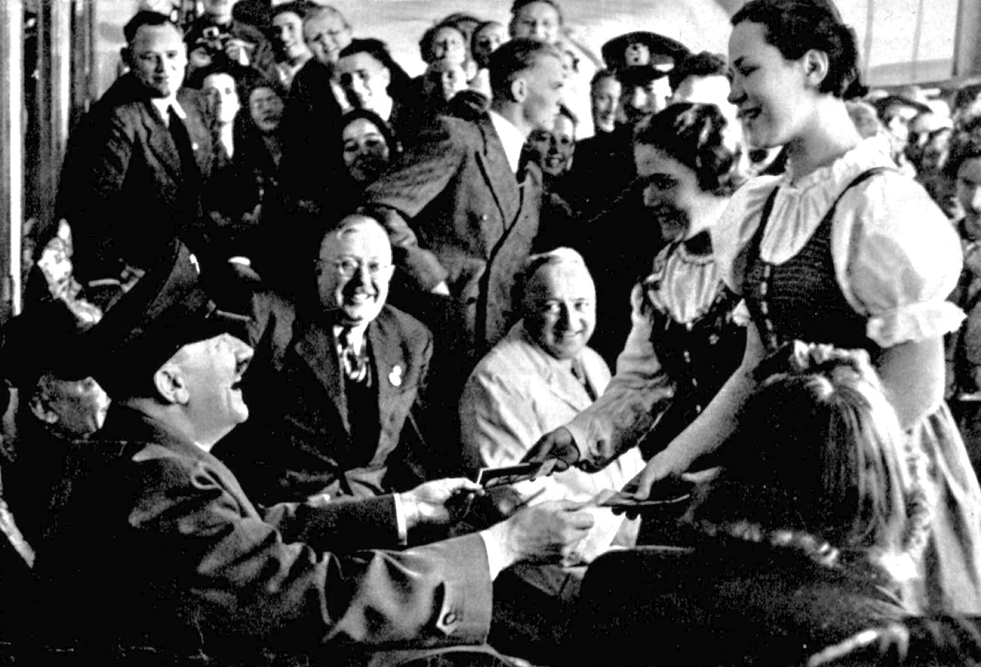 Adolf Hitler on board the Robert Ley KdF (Kraft durch Freude) ship greets crew members on 3 April 1939.Adolf Hitler on board the Robert Ley KdF (Kraft durch Freude) ship greets crew members on 3 April 1939.After his tour on the promenade deck, the Führer took the opportunity to accompany himself with fellow Holidaymakers.The Führer distinguished the great work of the “Strength through Joy” program by taking part in a multi-day trip on the “Robert Ley”. The disciplined on-board camaraderie enabled the Führer to participate in on-board life in an informal manner. Many autographed photos were exchanged with staff and vacationers as a memento of the time enjoyed on their special journey together. Adolf Hitler mingles with German workers and enjoys many of the daily activities on board the KDF flagship “Robert Ley” on 3 April 1939.Adolf Hitler prepares to depart the “Robert Ley” in Hamburg, the newest and most beautiful ship in the KdF fleet.Well I just had to include this magnificent photograph – the cover of the 13 April 1939 Illustrierter Beobachter reporting on Adolf Hitler’s journey on board the “Robert Ley” where these extremely rare and incredible photographs are printed and were just waiting to be re-discovered!