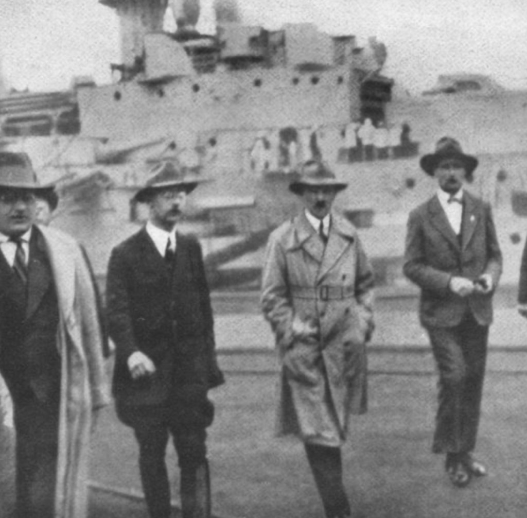 “The Voyage of the Führer in Italy”: King Victor Emmanuel III and Adolf Hitler, in the company of Nazi and Fascist authorities, during the naval review on board of the war ship ‘Conte di Cavour’, on the occasion of Hitler’s official visit to Italy in May 1938.