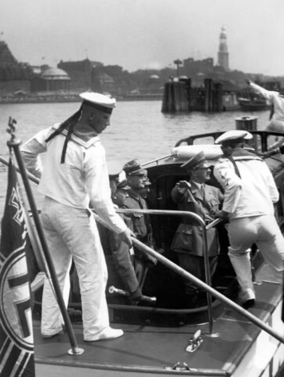 No information yet – but I discovered two more Hitler on a water taxi photos for my collection that I added below. Most likely this is in Hamburg given the “Hafenpolizei” boat seen in the background.Adolf Hitler leaves the battleship ‘Leipzig’ in Kiel on 22 May 1933, after an inspection together with Joseph Goebbels, Franz von Papen, Admiral Erich Raeder, und Werner von Blomberg. Heinrich Hoffmann can be seen standing on the ferry with his camera. Canoeists greet the Führer with the Hitler salute.