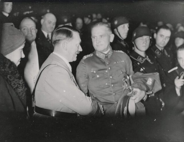 Adolf Hitler is welcomed by SA members on the occasion of the premiere of the film ‘SA-Mann Brand’ in the UFA Palast in Berlin on 28 May 1933.Reich Chancellor Adolf Hitler at the premiere of the film ‘SA-Mann Brand’ (“Storm Trooper Brand”) in the UFA-Palast am Zoo in Berlin on 28 May 1933. From right to left: Defense Minister Colonel-General Werner von Blomberg Reich Chancellor Adolf Hitler, Joseph Goebbels, unknown and Reich Labor Minister Franz Seldte. The film presents the story of a truck driver, Fritz Brand, who joins the Nazi Sturmabteilung to defend Germany against communist subversion orchestrated from Moscow.