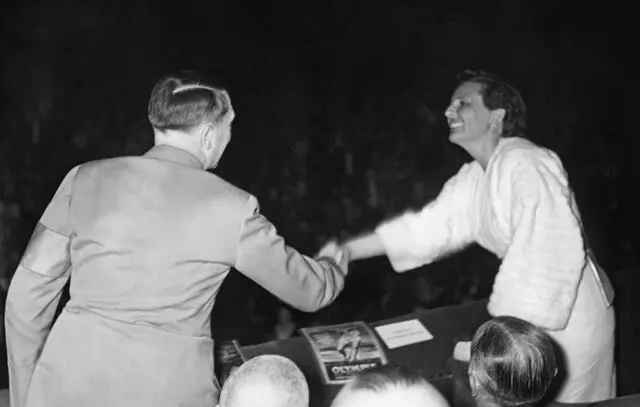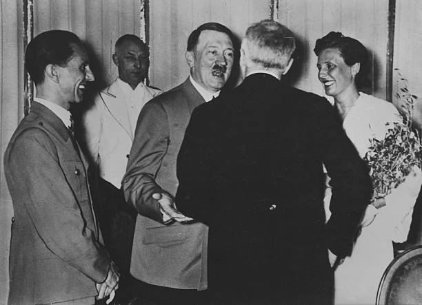 Adolf Hitler arrives in the Ufa-Palast in Berlin for the premiere of the Olympia film. The film premiered on Hitlerâs 49th birthday on 20 April 1938.Adolf Hitler and Joseph Goebbels at the premiere of the film ‘Olympia – Festival of the Nations’ by Leni Riefenstahl in the UFA-Palast am Zoo in Berlin, 1938. First row, from right: Maria Kimmich, the sister of Goebbels, Minister Walther Funk, Foreign Minister Joachim von Ribbentrop, Joseph Goebbels, Adolf Hitler and Leni Riefenstahl. Second row, from right.: Reich Press Chief Otto Dietrich, Secretary of State Karl Hanke and SA Obergruppenfuehrer Wilhelm Brueckner.Reception arranged for Leni Riefenstahl in honor of the premiere of the film “Olympiaâ at the UFA Palace on 20 April 1938.Adolf Hitler congratulates Leni Riefenstahl at the premiere of the Olympia film on 20 April 1938.Adolf Hitler at the Ufa-Palast in Berlin for the premiere of the âOlympiaâ film on 20 April 1938.Adolf Hitler and party meeting Leni Riefenstahl during a break between showings at the premiere of ‘Olympia’ at the UFA-Palast, Berlin, 1938 featuring from left to right: Josef Goebbels, Reich Minister of Propaganda in Nazi Germany, Adolf Hitler, Ambassador Rangabe, (Helene Bertha Amalie Riefenstahl) aka Leni Riefenstahl, German film director, actress and dancer,Reception on the occasion of the premiere of olympiad film (part 1: Festival of peoples / part 2 Festival of Beauty) at Ufa-palace in Berlin. F.l.t.r. Joseph Goebbels, Hitler, Alexander Rizo-Rangabe (greek diplomat), Leni Riefenstahl.Blick in die Ehrenloge anlĂ€sslich der UrauffĂŒhrung des Olympiafilms im Ufa-Palast, v.r.: Funk, Goebbels, Hitler, Frick, ReichssportfĂŒhrer von Tschammer und Osten. Adolf Hitler at the Ufa-Palast in Berlin for the premiere of the Olympia film.