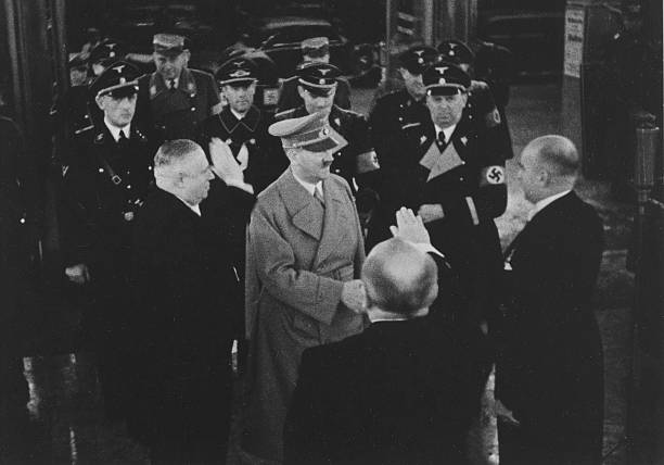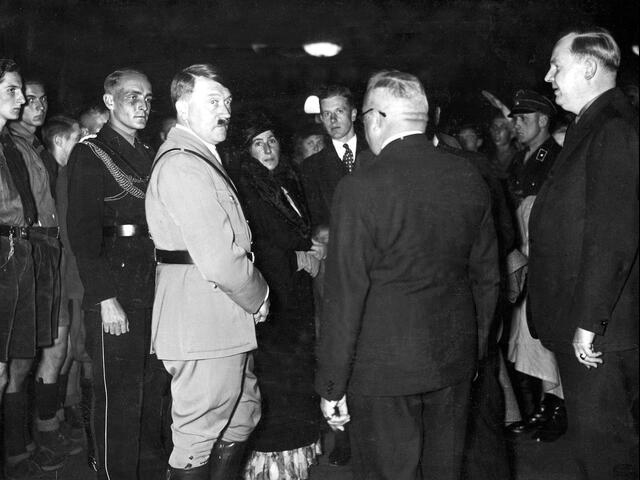 Adolf Hitler at the world premiere of the film ‘Hitlerjunge Quex’, in Berlin: Hitler in conversation with Ufa board member, Alexander Grau (with his back to the camera), where he attended the premiere of the movie ‘Hitler Youth Quex’ by Hans Steinhoff on 11 September 1933.Adolf Hitler at the world premiere of the film ‘Hitlerjunge Quex’ in Berlin.: Hitler in conversation with Ufa board member, Alexander Grau (with his back to the camera), and Hermann Göring.