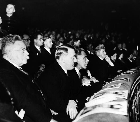 Alfred Hugenberg and Adolf Hitler at the premiere of the submarine film “Morgenrot” in the UFA-Filmpalast on 2 February 1933.Alfred Hugenberg and Adolf Hitler at the premiere of the submarine film “Morgenrot” in the UFA-Filmpalast on 2 February 1933.