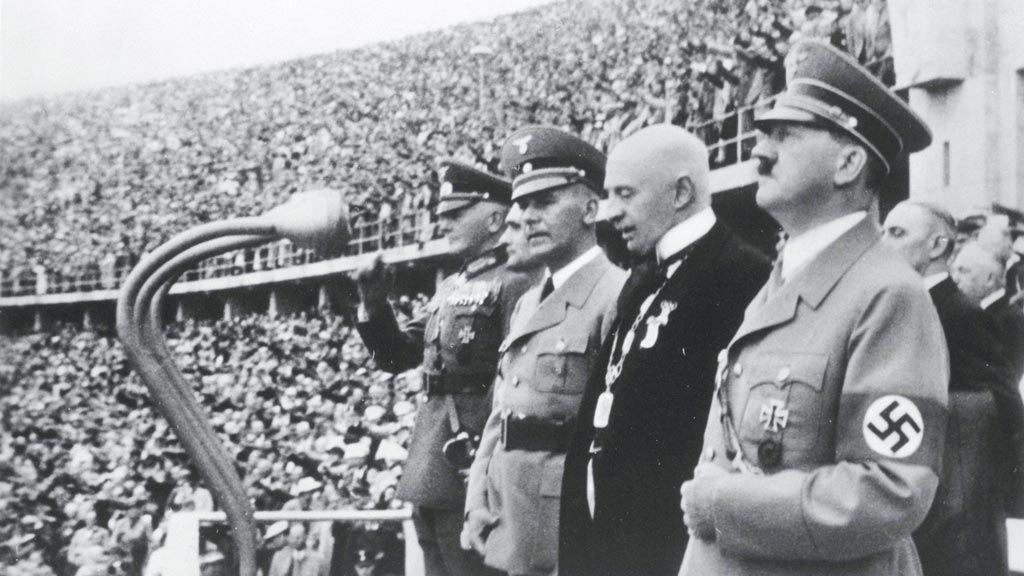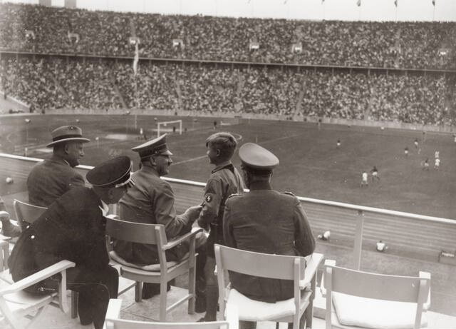 Adolf Hitler watches a football game from the stands of the 1936 Berlin Olympic Games. The 1936 Berlin Olympic Games under Adolf Hitler’s Nazi dictatorship were more than just a global sporting event; they were also a showcase of Nazi propaganda.