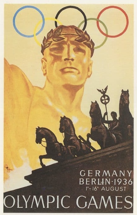 The official poster for the 1936 Olympic Games was created by Nazi artist Franz Würbel. Classical realism was strongly favored by Hitler, and the design incorporates sculpture from Berlin’s landmark Brandenburg Gate and a heroic Olympian athlete crowned with laurels.