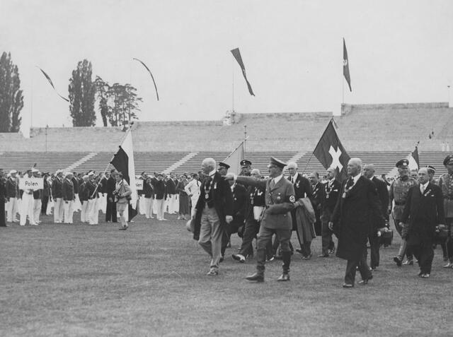 Before the ceremonial opening of the XI Olympic Games. Together with the members of the International and National Olympic Committee, the leader and Reich Chancellor goes through the marathon gate into the stadium. Left of Adolf Hitler [Henri] Count Baillet-Latour, right Excellency [Theodor] Lewald. Organizing Committee of the Olympic Games, IOC, State Secretary, Germany Baillett-Latour, Henri de Graf: President of the International Olympic Committee (IOC), Belgium.