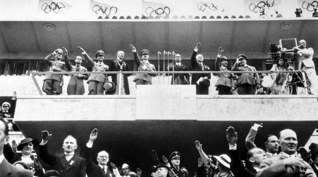 Nazi soldiers salute to greet the arrival of the Olympic torch and commencement of the 1936 games. Swastika banners hang in the background to maximize the propaganda value to Adolf Hitler and Nazi Germany.