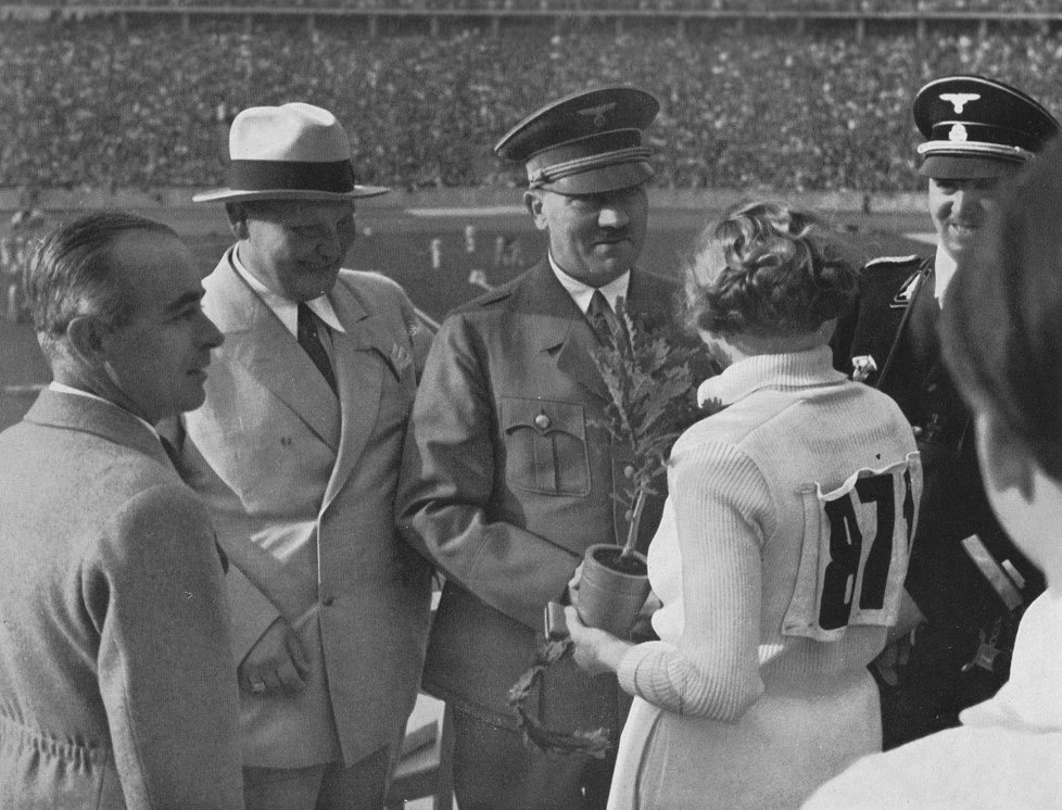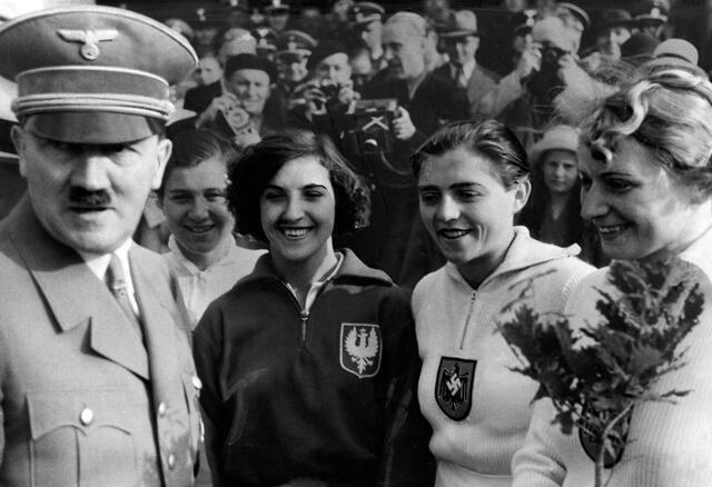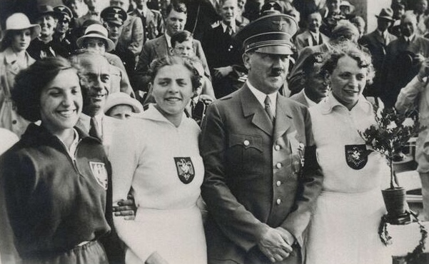 Adolf Hitler with the medal winners in Javelin throwing, Tilly Fleischer, Luise Krüger and the Polish athlete Maria Kwasniewska,