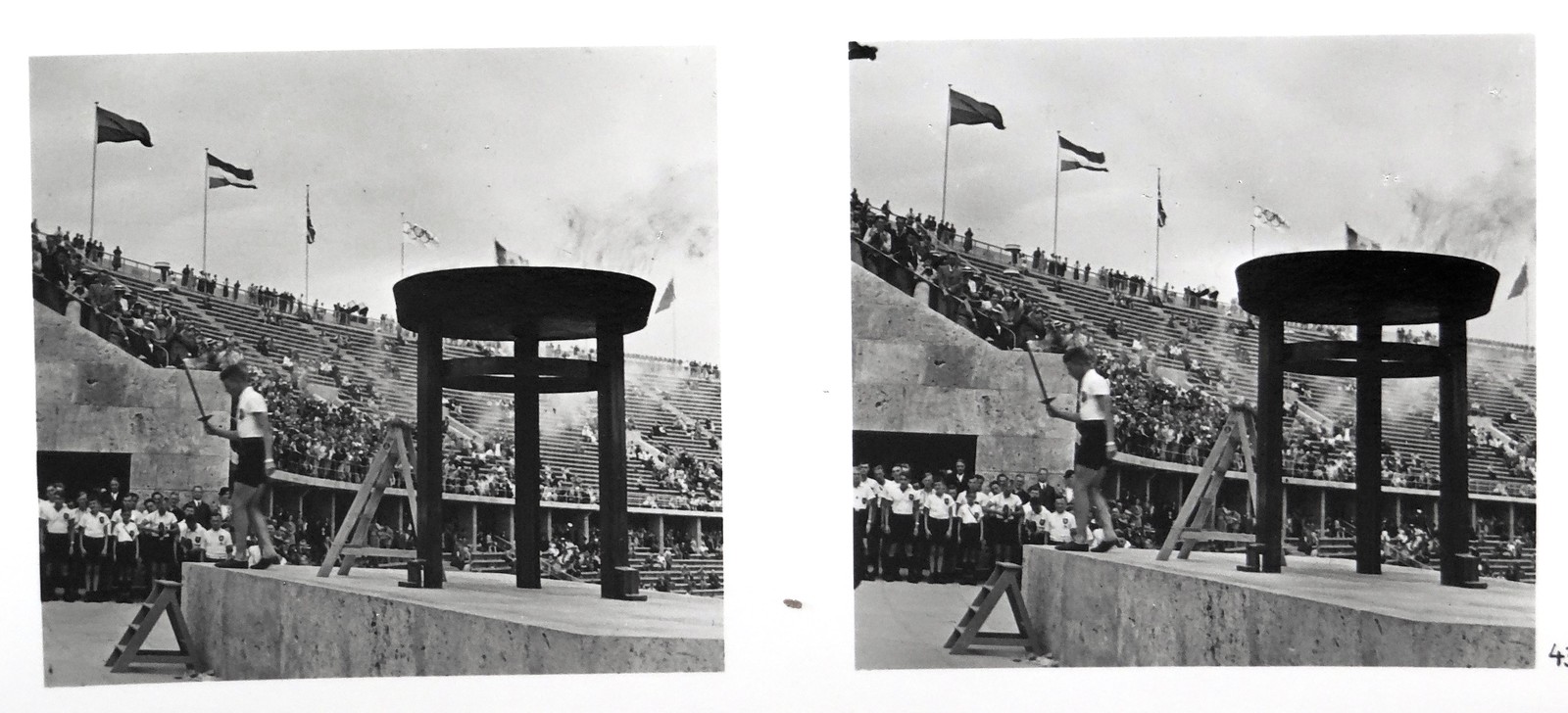 Lighting the Olympic Flame at the 1936 Summer Olympic Games in Berlin on 1 August 1936. Stereoview card from the book “Die Olympischen Spiele 1936” by Heinrich Hoffmann.