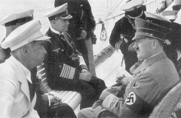 Adolf Hitler with the Commander of the navy and Chairman of the Reichs Sports Hans von Tschammer und Osten on board at the sailing regattas on the Kiel Canal on 9 August 1936.